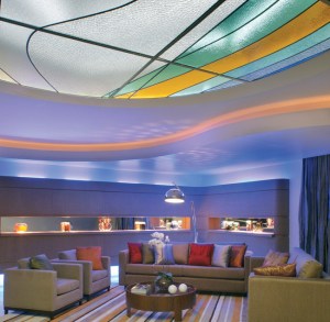 Esse painel é o cenário do ambiente onde foi instalada um sistema de iluminação, que troca a cor das luzes, alterando a atmosfera do ambiente. Nos nichos do painel, foram colocados objetos que além de decorativos, são funcionais, tendo por exemplo, lápis, balas e remédios. “Esse estilo é muito eclético, mas precisa ser usado de forma correta, para que o local não fique cansativo. Ai está o nosso segredo”, afirmou Aquiles.