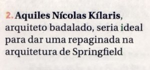 Sem-categoria Springfield Publicado por kilaris em fevereiro 24, 2008dezembro 7, 2017 Acima, o arquiteto Aquiles Nícolas Kílaris “Simpsonizado” pela coluna do jornal O Liberal, com muito bom humor! ir para o site www.arquitetoaquiles.com.br Compartilhe isso: Compartilhar no Facebook(abre em nova janela) Facebook Compartilhar no X(abre em nova janela) 18+ Curtir Carregando... Relacionado