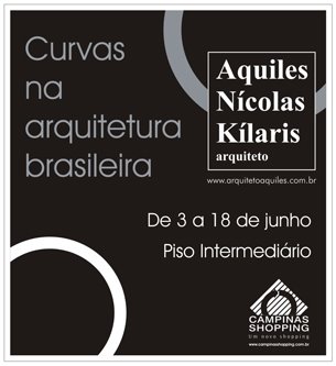 O Campinas Shopping apresenta de 3 a 18 de julho, no Piso Intermediário, a exposição “Curvas na Arquitetura Brasileira”, do arquiteto Aquiles Nícolas Kílaris, pioneiro no movimento arquitetônico que valoriza linhas curvas. A exposição tem como objetivo difundir a arquitetura como forma de arte e, para isso, são apresentadas vinte fotos coloridas de projetos, concepção, reformas, interiores e registro de antes e depois dos trabalhos realizados. Além disso, duas maquetes estão expostas, sendo um projeto residencial e a de um Estádio de Rodeios.