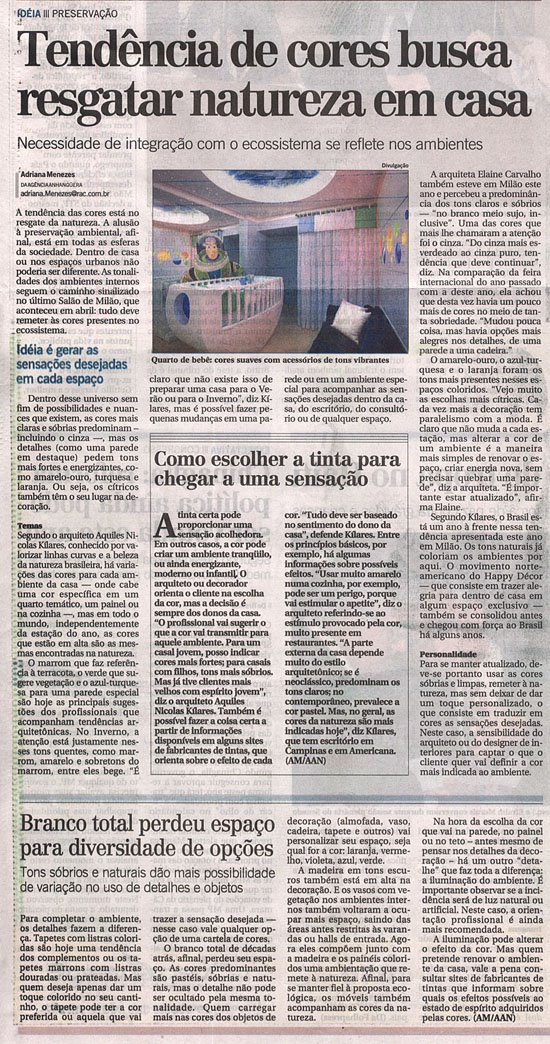 A arquiteta Elaine Carvalho também esteve em Milão este ano e percebeu a predominância dos tons claros e sóbrios — “no branco meio sujo, inclusive”. Uma das cores que mais lhe chamaram a atenção foi o cinza. “Do cinza mais esverdeado ao cinza puro, tendência que deve continuar”, diz. Na comparação da feira internacional do ano passado com a deste ano, ela achou que desta vez havia um pouco mais de cores no meio de tanta sobriedade. “Mudou pouca coisa, mas havia opções mais alegres nos detalhes, de uma parede a uma cadeira.”O amarelo-ouro, o azul-turquesa e o laranja foram os tons mais presentes nesses espaços coloridos. “Vejo muito as escolhas mais cítricas. Cada vez mais a decoração tem paralelismo com a moda.