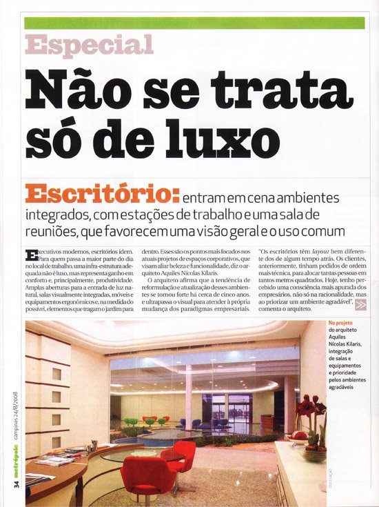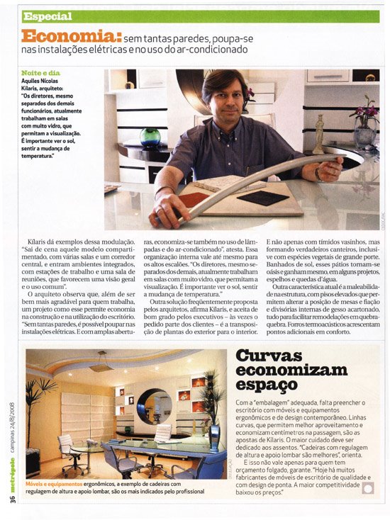 Acima, matéria da Revista Metrópole, com o arquiteto Aquiles Nícolas Kílaris mostrando o novo conceito em projetar escritórios.ir para o site www.arquitetoaquiles.com.br