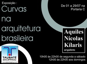 Começa dia 01/07 a exposição “Curvas na Arquitetura Brasileira”, que levará a Taubaté as linhas sinuosas do trabalho do arquiteto Aquiles Nícolas Kílaris. Até dia 29 de julho, o Taubaté Shopping recebe maquetes, painéis de fotos e projetos do arquiteto, que têm como principal objetivo difundir a arquitetura como forma de arte. A exposição gratuita e aberta ao público estará na portaria C, em frente à loja Gamaia, durante todo o horário de funcionamento do shopping.