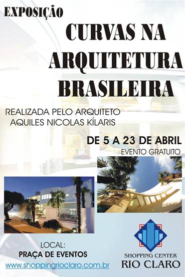 O Shopping Rio Claro apresenta até o dia 23 de abril a exposição itinerante “Curvas na arquitetura brasileira”. A mostra, que pode ser vista na Praça de Eventos II, conta com 20 painéis de vidro e 40 fotos coloridas, focando projetos arquitetônicos, concepções, fachadas e interiores. O objetivo é difundir a arquitetura como forma de arte.
