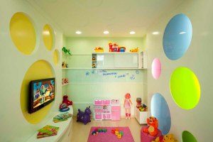 “Em um de nossos projetos, utilizamos na parede círculos coloridos de acrílico, com a função de abajur. Também criamos um painel para recados e um móvel funcional para acomodar os brinquedos. Projetamos ainda um painel com círculos amarelos, estilizando uma “pegada” de animal. No centro da “pegada” foi instalada uma tela de LCD para os jogos de vídeo game e filmes de DVD. Acompanhando os círculos de acrílico, trabalhamos o mesmo desenho no teto de gesso”, disse ele.