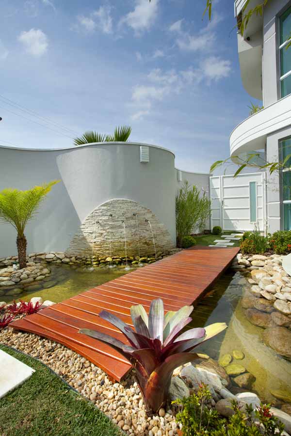 Neste projeto, foi criado um paisagismo especial para acompanhar as linhas sinuosas do espelho d’água. Uma ponte de madeira atravessa toda a extensão do lago, onde foram colocadas pedras de diversos tamanhos e carpas. Ao fundo, no muro, brota uma fonte, que contribui para a movimentação da água.