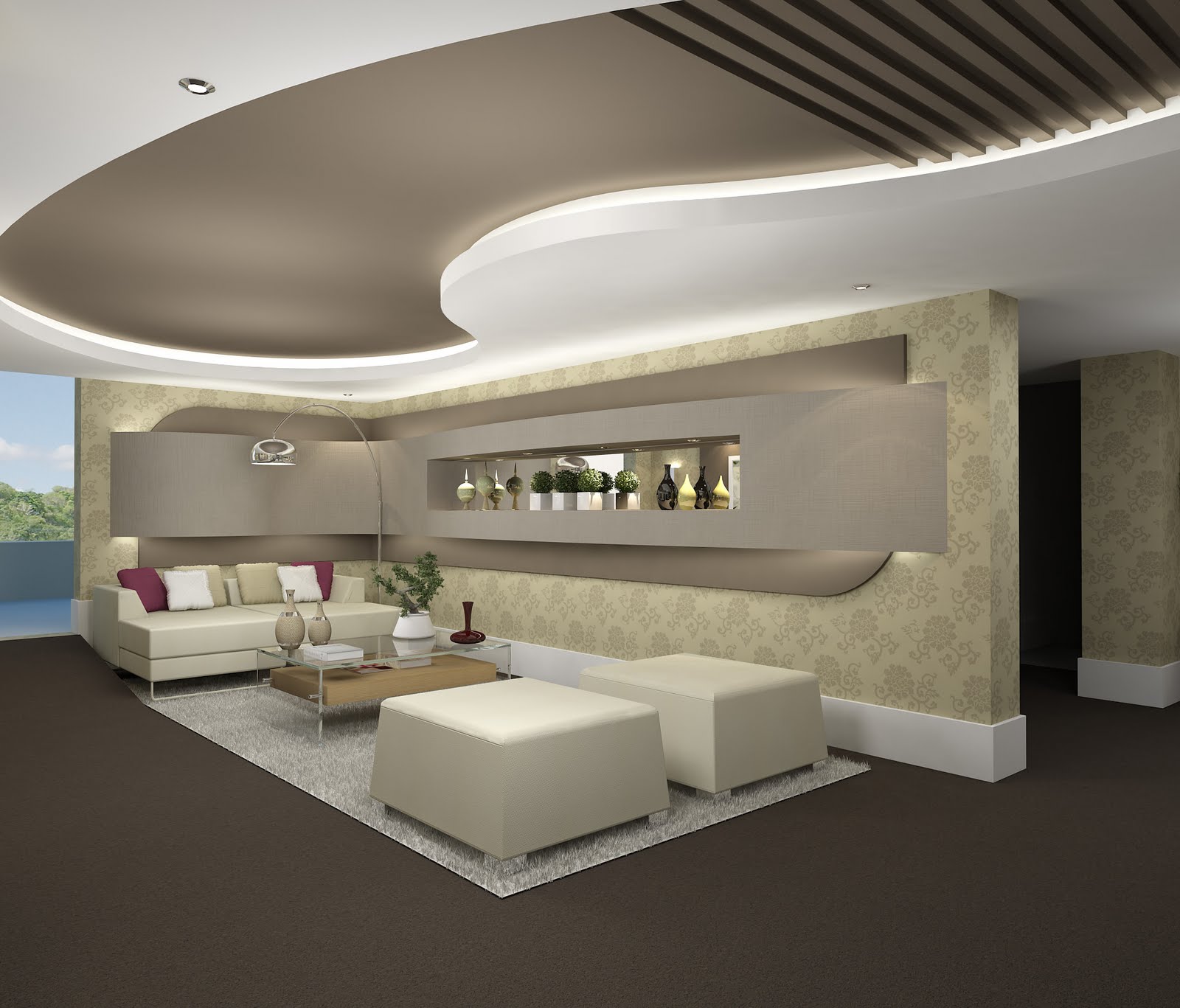 Nos 76 m² do ambiente as cores predominantes foram o branco, chocolate e creme. A tinta usada nos móveis e esculturas de gesso é um lançamento da Suvinil e confere à superfície pintada uma textura semelhante ao linho. As paredes receberam aplicação de papel de parede. O projeto luminotécnico valoriza as formas e volumes da arquitetura de interiores e utiliza fitas de LED que proporcionam baixo consumo de energia.