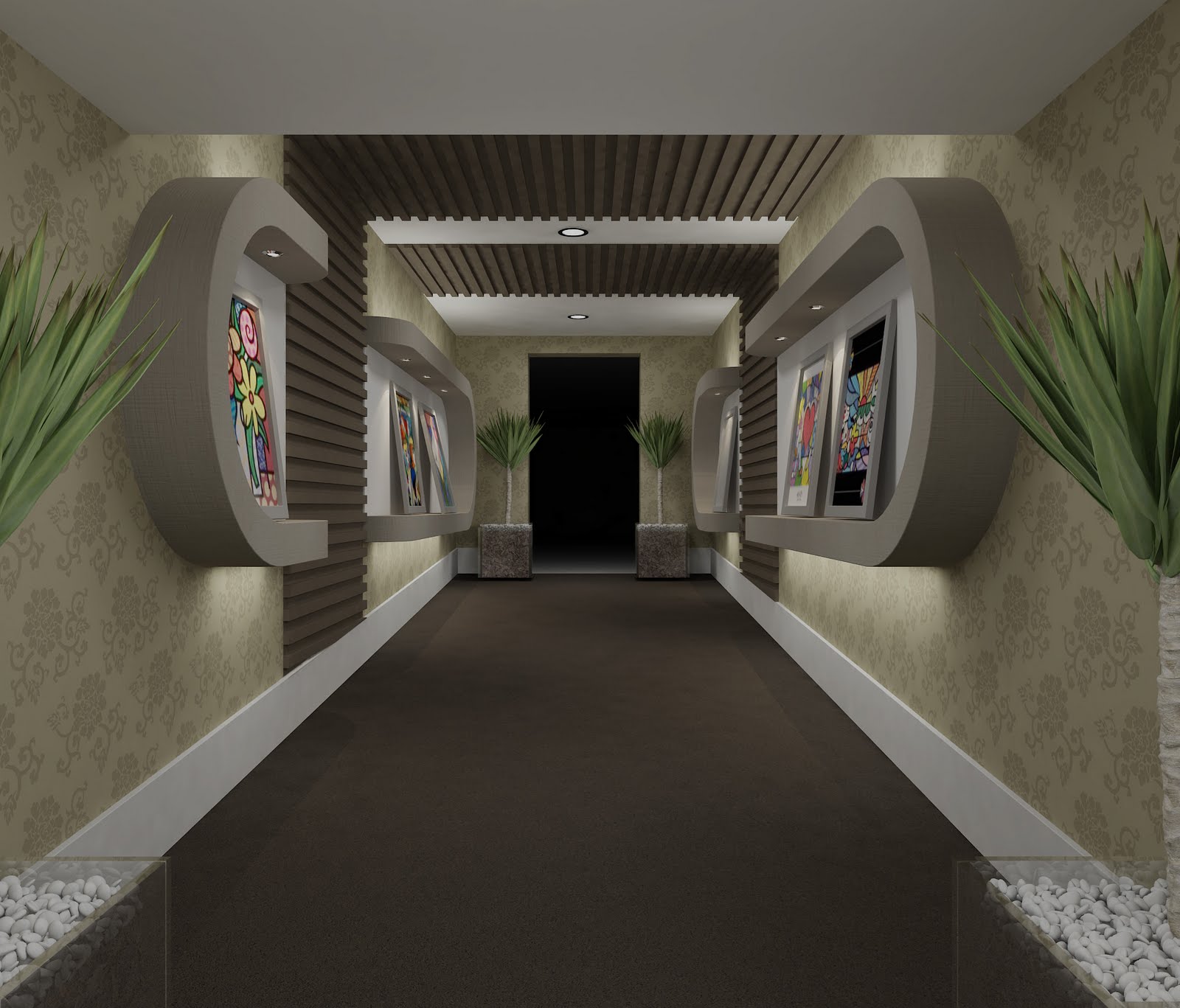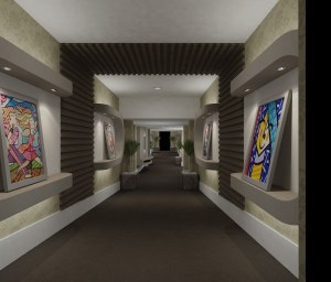 Além da Sala de Estar, os profissionais projetaram uma galeria de arte em uma área de corredor que percorre vários ambientes da mostra. Com isso, levaram beleza e harmonia a uma área funcional de circulação. A cor e a alegria deste espaço está nos quadros instalados em nichos especialmente projetados para a mostra e que receberam iluminação focada, ganhando destaque diferenciado.