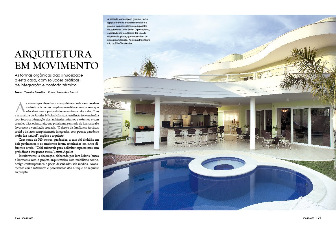 A revista Casa Mix Campinas, edição número 93, apresenta uma casa de 510 m² dividida em dois pavimentos e setorizada em cinco diferentes níveis, criando total integração entre as áreas sociais e de lazer. A casa foi projetada pelo arquiteto Aquiles Nícolas Kílaris.