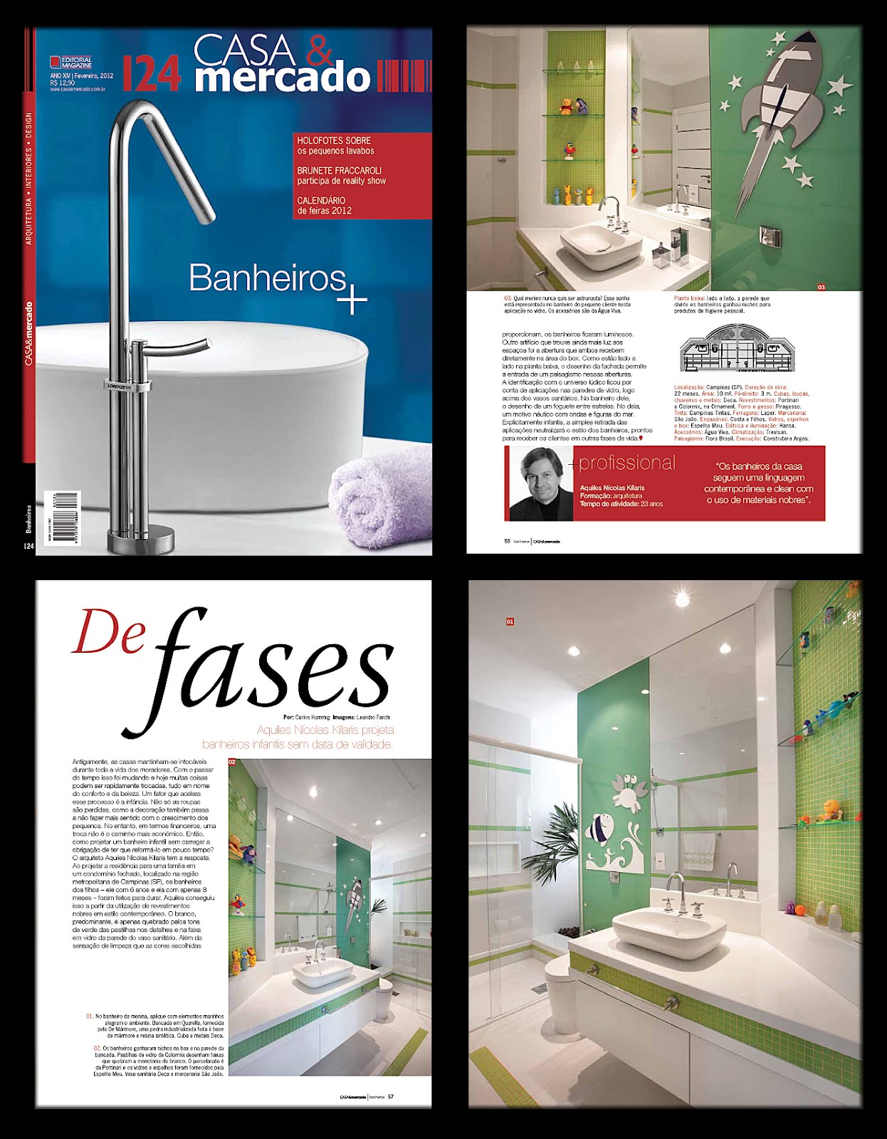 Na revista Casa & Mercado, edição número 124, o arquiteto Aquiles Nícolas Kílaris mostra e dá dicas de como criar banheiros sem data de validade. Ao projetar uma residência, na região metropolitana de Campinas, os banheiros dos filhos, o menino com 6 anos e a menina com apenas 8 meses, foram feitos para durar.