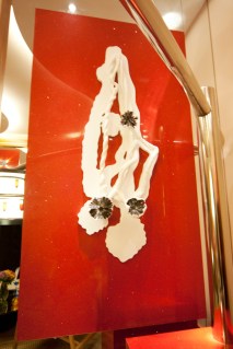 A cor vermelha da pedra silestone abriga uma das esculturas, chamando atenção ao olhar, enquanto a outra, denominada Bailarina da Natureza, com altura de 2 metros, encontra-se sobre uma base de espelho.