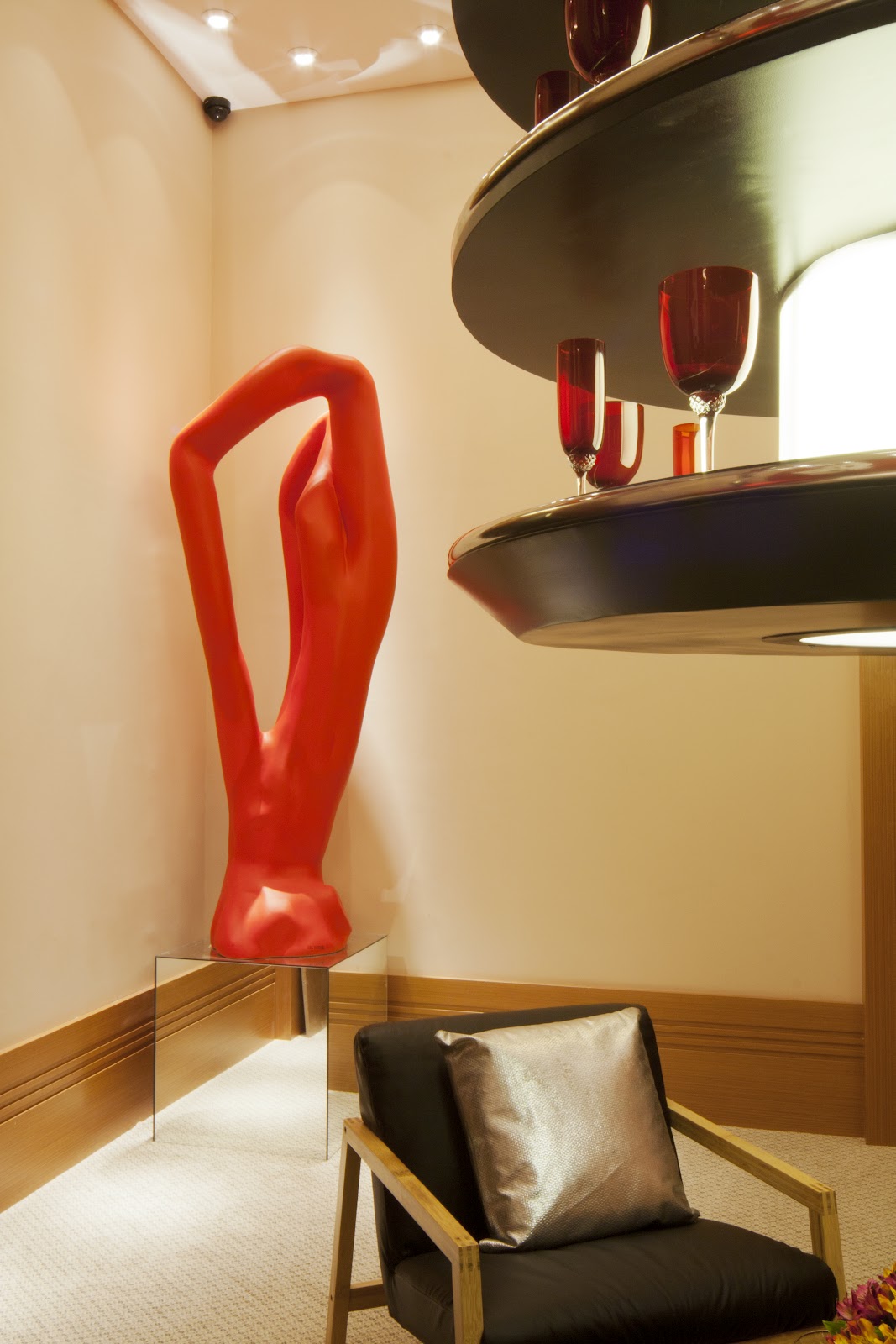 A cor vermelha da pedra silestone abriga uma das esculturas, chamando atenção ao olhar, enquanto a outra, denominada Bailarina da Natureza, com altura de 2 metros, encontra-se sobre uma base de espelho.