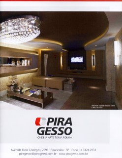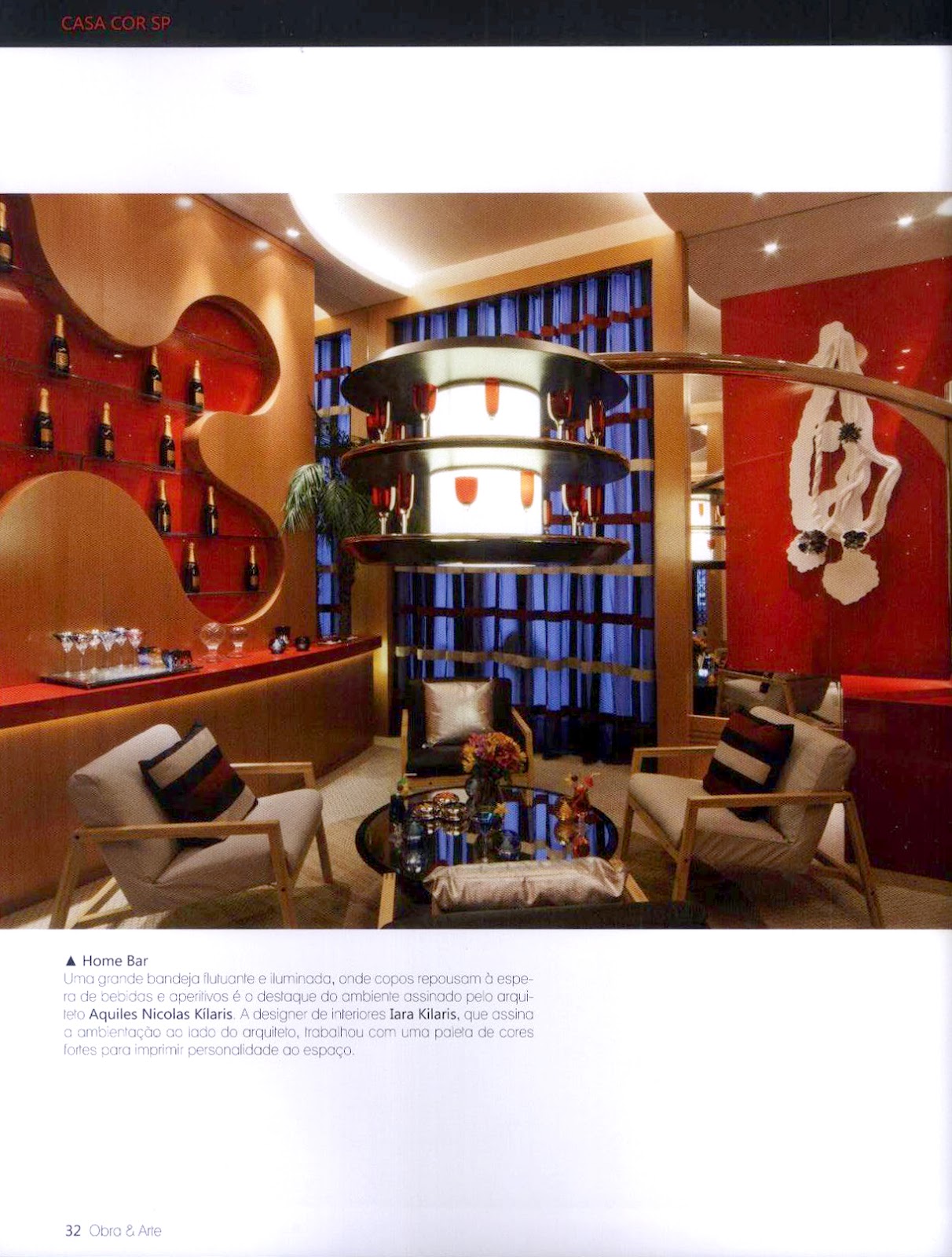 Na mostra Casa Cor São Paulo, a grande bandeja flutuante é o destaque do ambiente Home Bar. A revista Obra & Arte, número 11, publicou o projeto assinado pelo arquiteto Aquiles Nícolas Kílaris e ambientado pela designer de interiores Iara Kílaris.