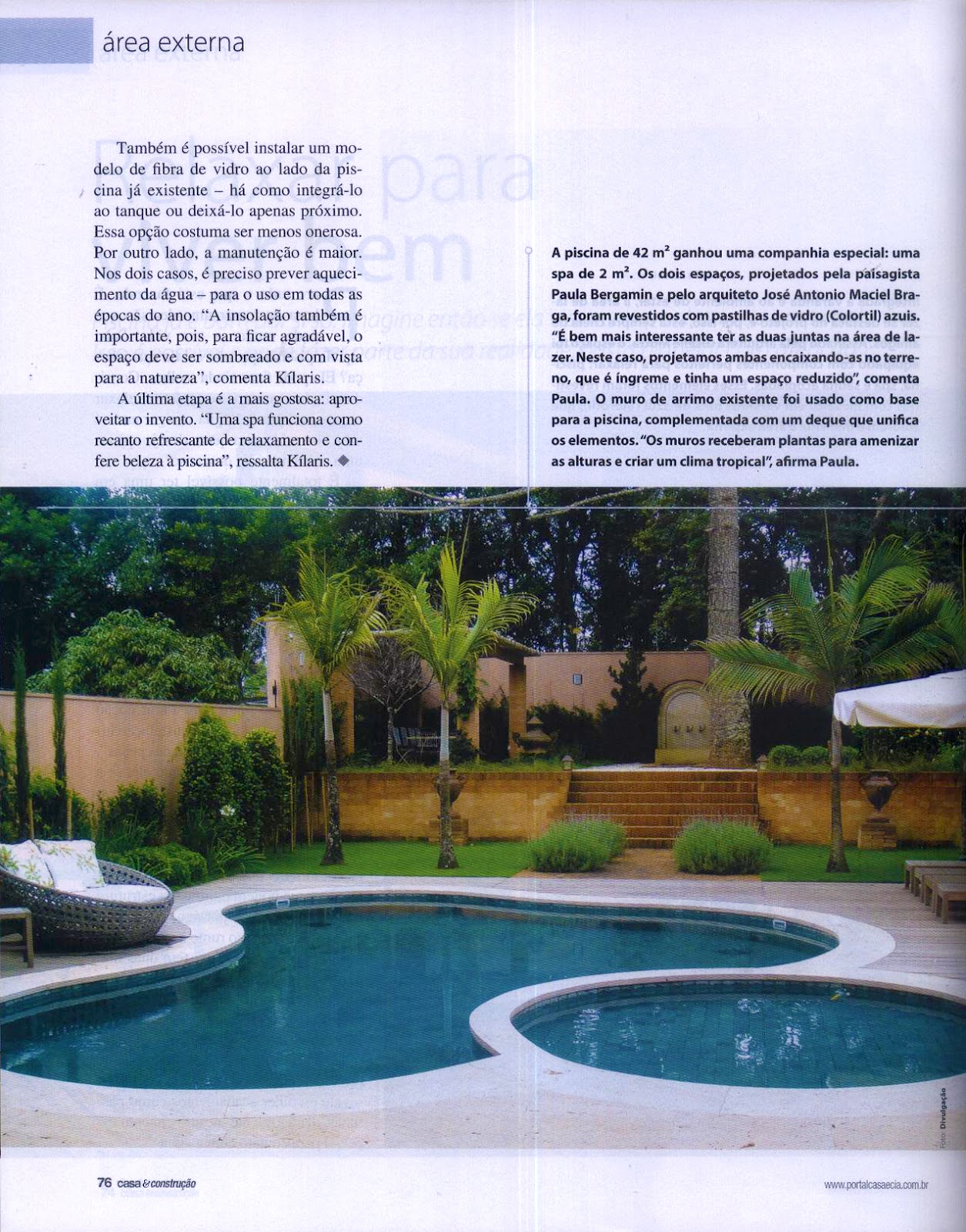 A revista Casa & Construção, número 89, publicou o projeto do arquiteto Aquiles Nícolas Kílaris e deu dicas de como planejar uma área de lazer com piscina e spa acoplados tornando-se uma boa saída para o descanso.