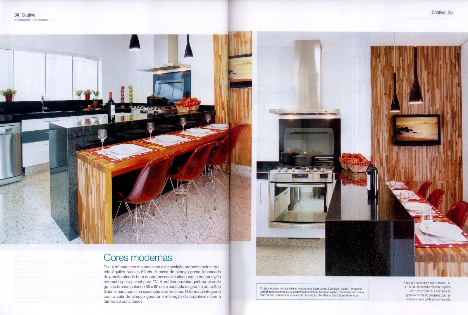 A revista Cozinhas & Salas de Almoço, número 47, publicou o projeto do arquiteto Aquiles Nícolas Kílaris de uma cozinha de 14 m² que ganhou amplitude com disposição dos móveis, que permitem, também, a interação de quem prepara os pratos com a família e os amigos.