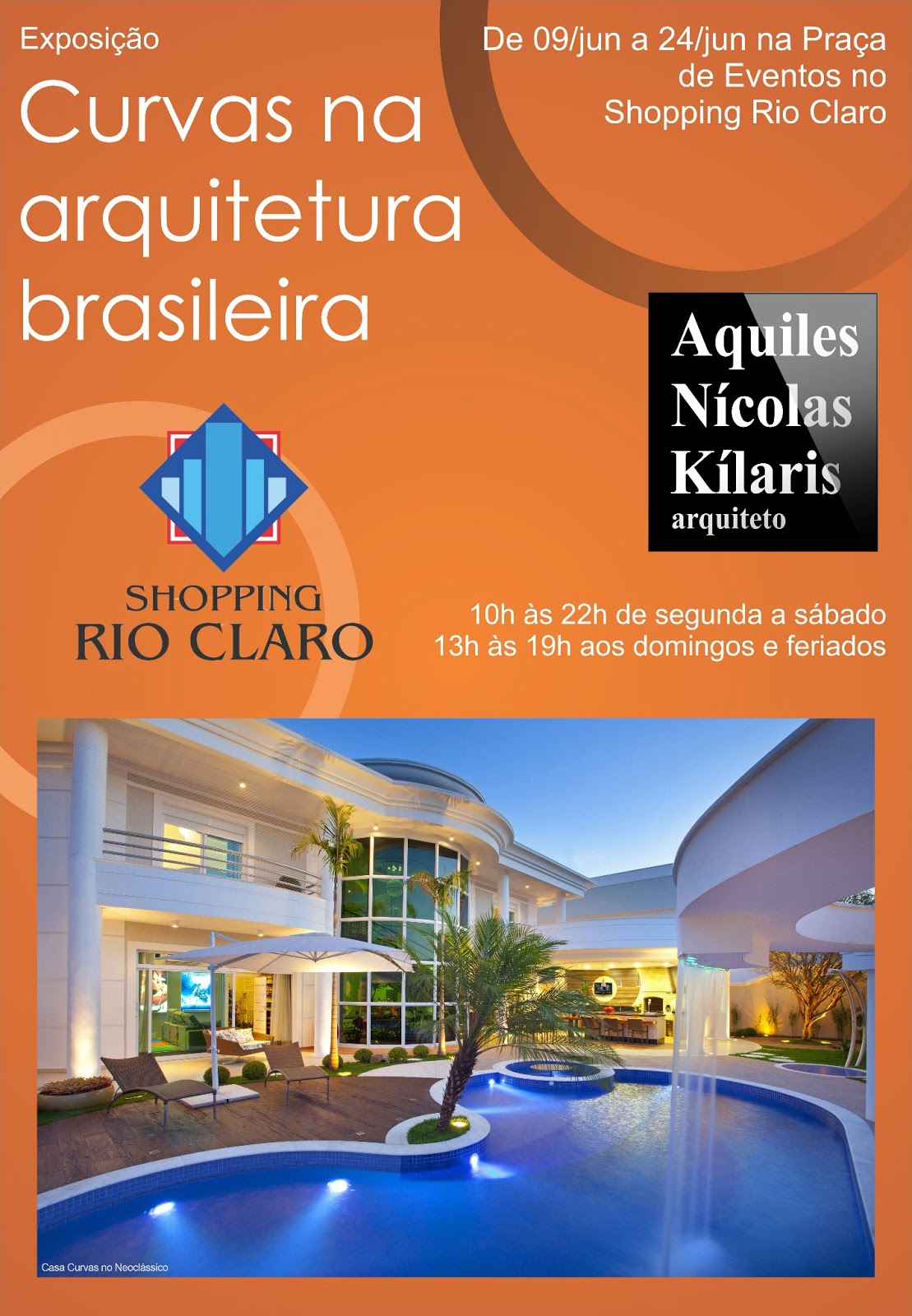 No período de 09 de junho a 24 de junho de 2013, será realizada a exposição itinerante “Curvas na Arquitetura Brasileira” do arquiteto Aquiles Nícolas Kílaris no Shopping Rio Claro.