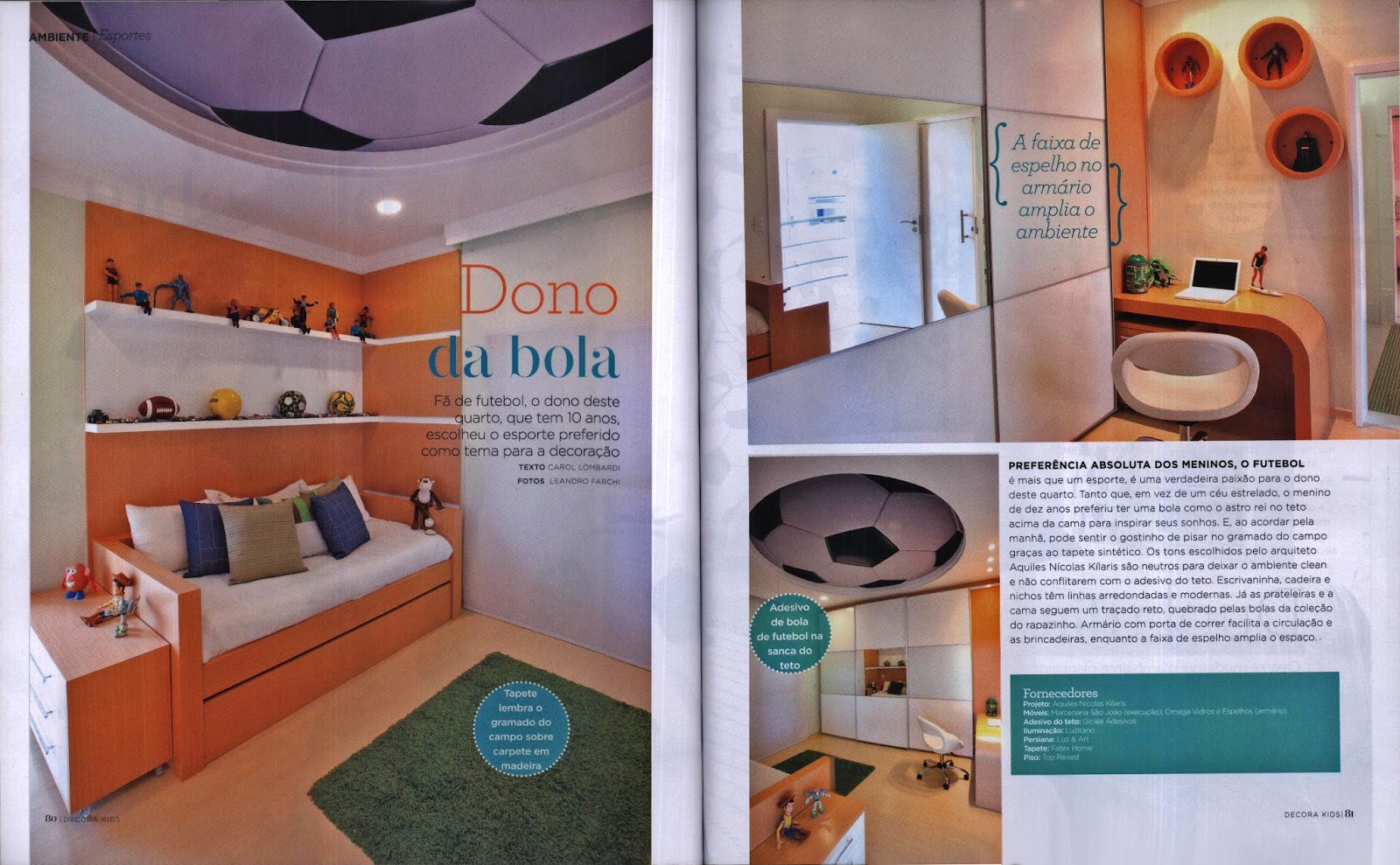 A revista Decora Kids, número 1, publicou o projeto de quarto, do arquiteto Aquiles Nícolas Kílaris, para um menino de 10 anos. O quarto tem como tema para a decoração o esporte preferido do garoto, o futebol.