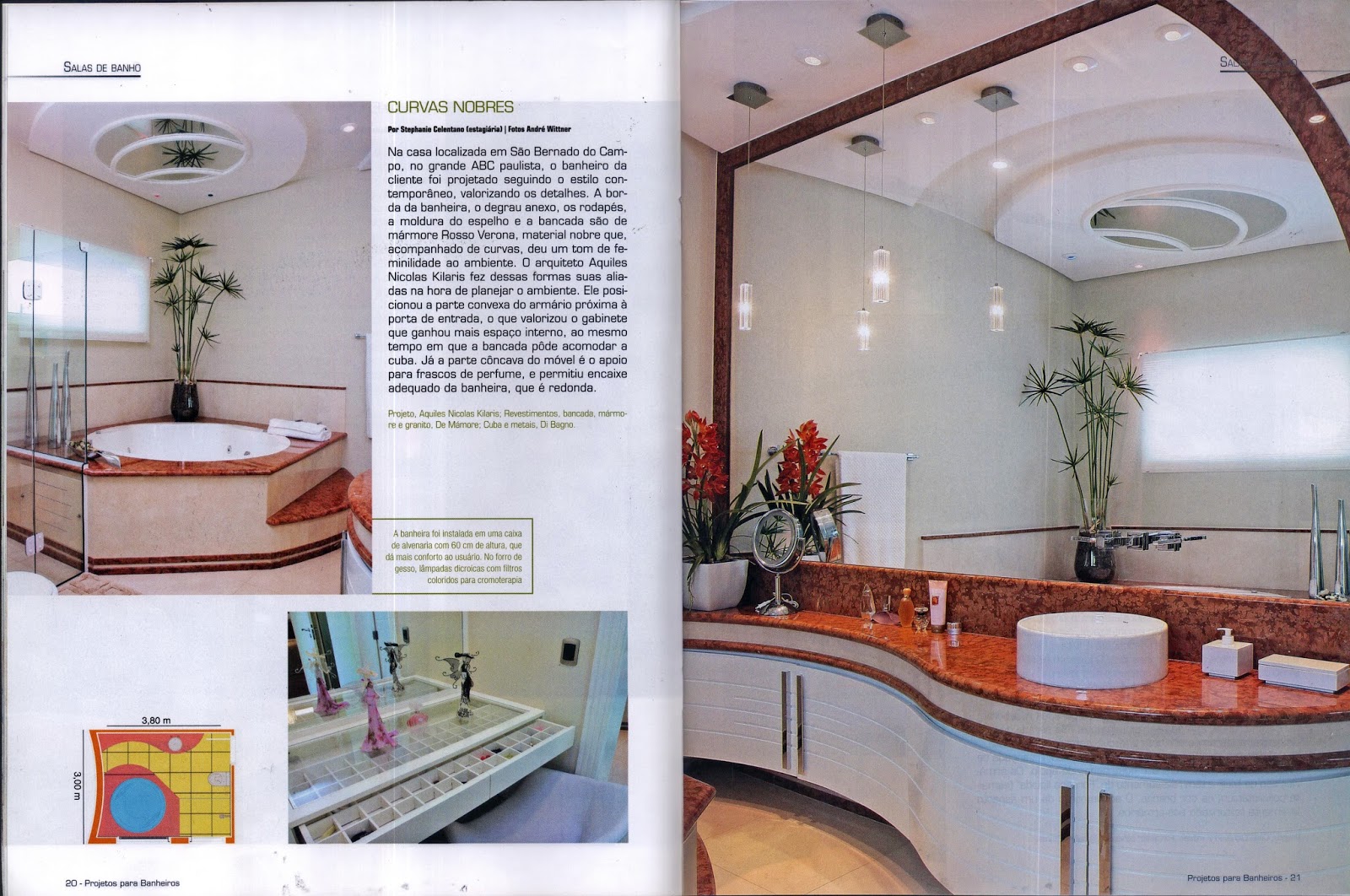 A revista Projetos para Banheiros, número 24, publicou o projeto de banheiro do arquiteto Aquiles Nícolas Kílaris. O espaço, acompanhado de curvas, recebeu o mármore Rosso Verona, que deu um toque de feminilidade ao ambiente.