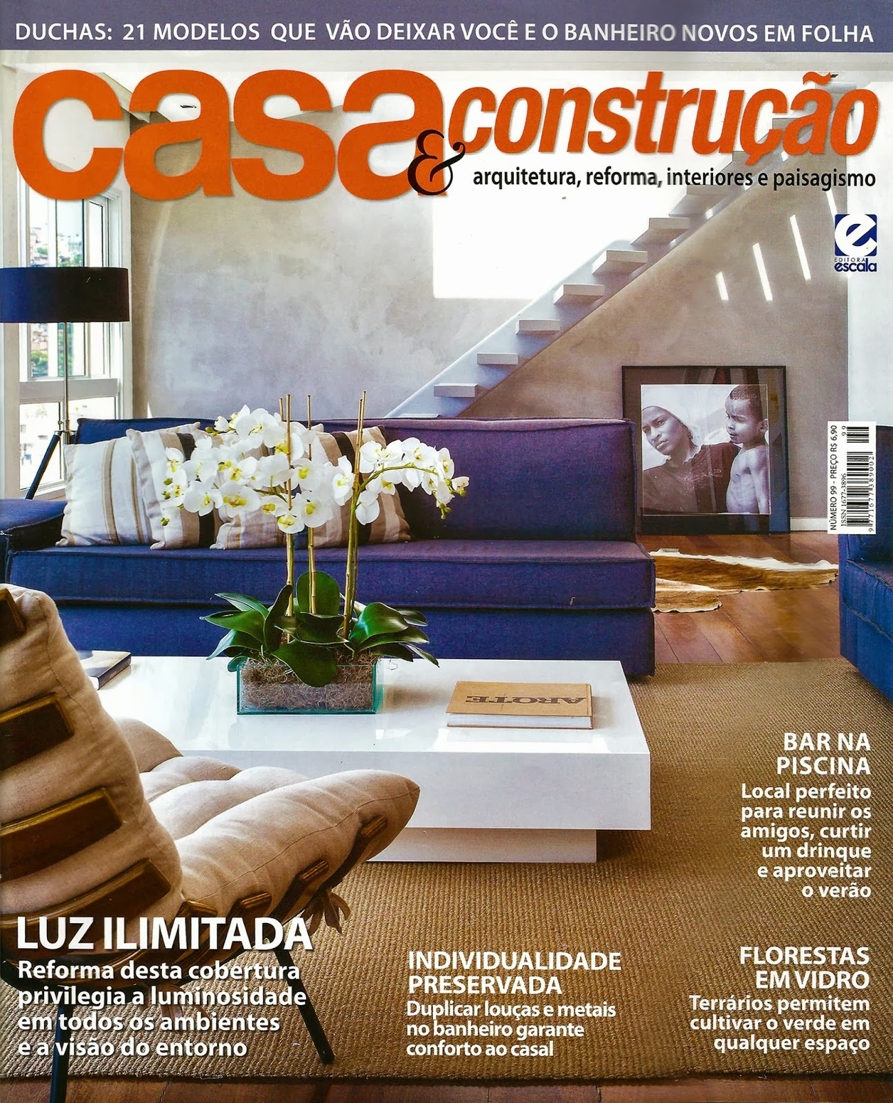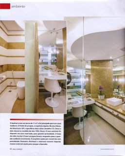 O banheiro, com cerca de 11 m², foi planejado para um casal contemporâneo, onde os pisos e paredes, revestidos de porcelanato Diamante Flash e mármore marrom imperial, conferem movimento ao espaço. O projeto do arquiteto Aquiles Nícolas Kílaris foi publicado na revista Casa & Construção de número 99.