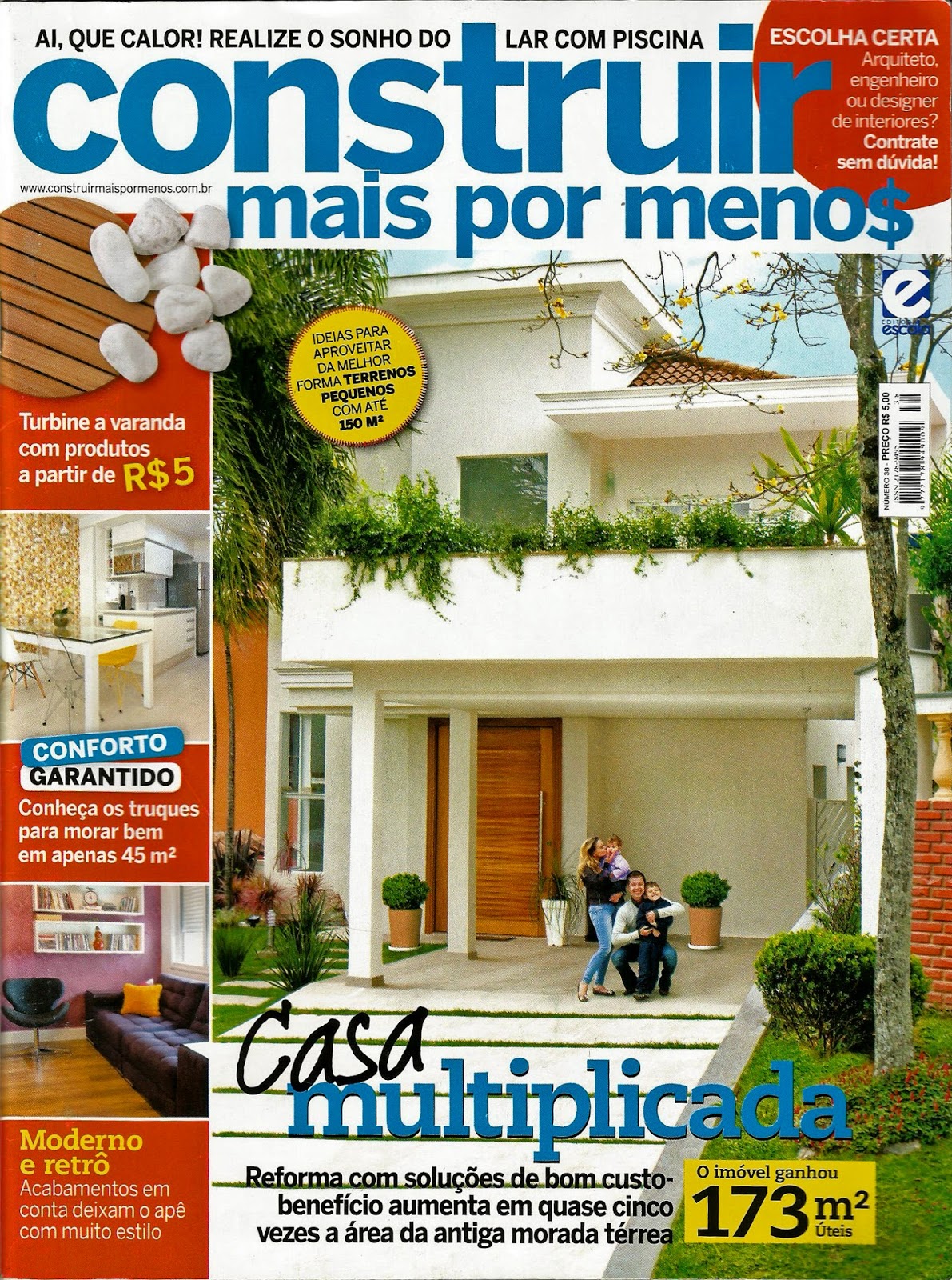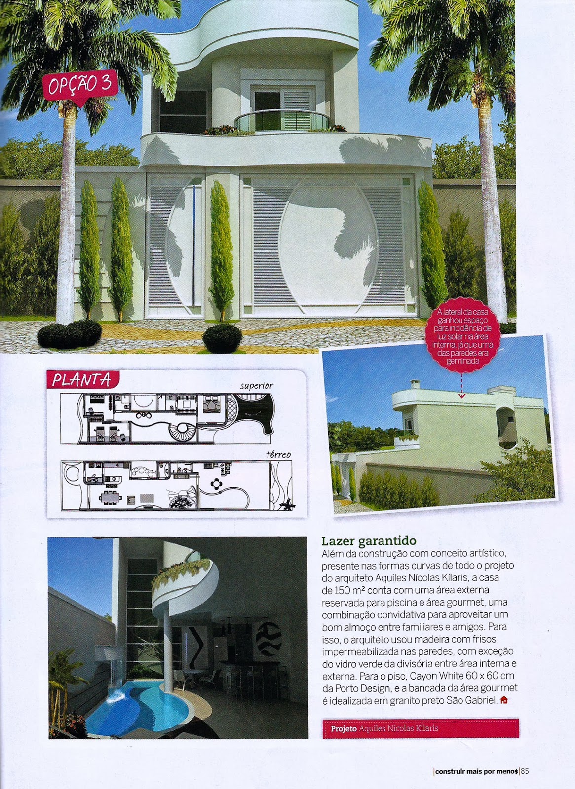 A revista Construir mais por menos, número 38, publicou o projeto de 150 m² do arquiteto Aquiles Nícolas Kílaris. Ele conta com uma área externa reservada para área gourmet e piscina, criando uma combinação convidativa para aproveitar bons momentos entre familiares e amigos.