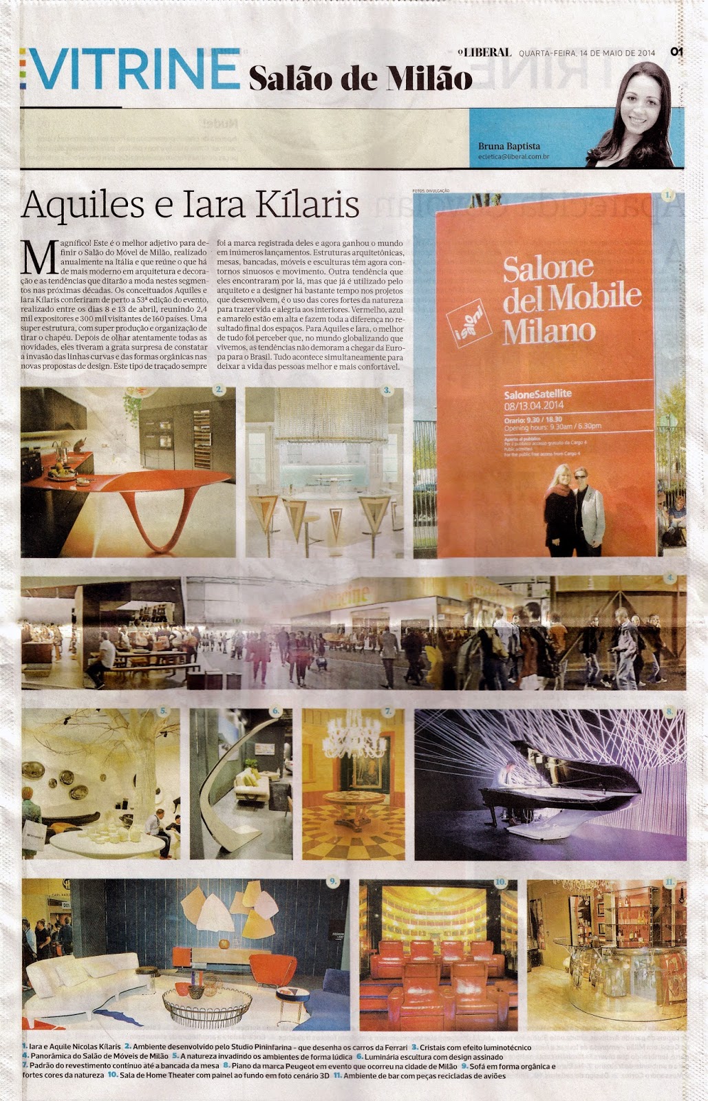O arquiteto Aquiles Nícolas Kílaris e a designer de interiores Iara Kílaris conferiram de perto a 53º edição do Salão de Móvel de Milão. Ao olhar atentamente todas as novidades, puderam constatar a invasão das linhas curvas e formas orgânicas nas novas propostas de design. O jornal O Liberal, de 14 de maio de 2014, publicou no caderno Vitrine a matéria.