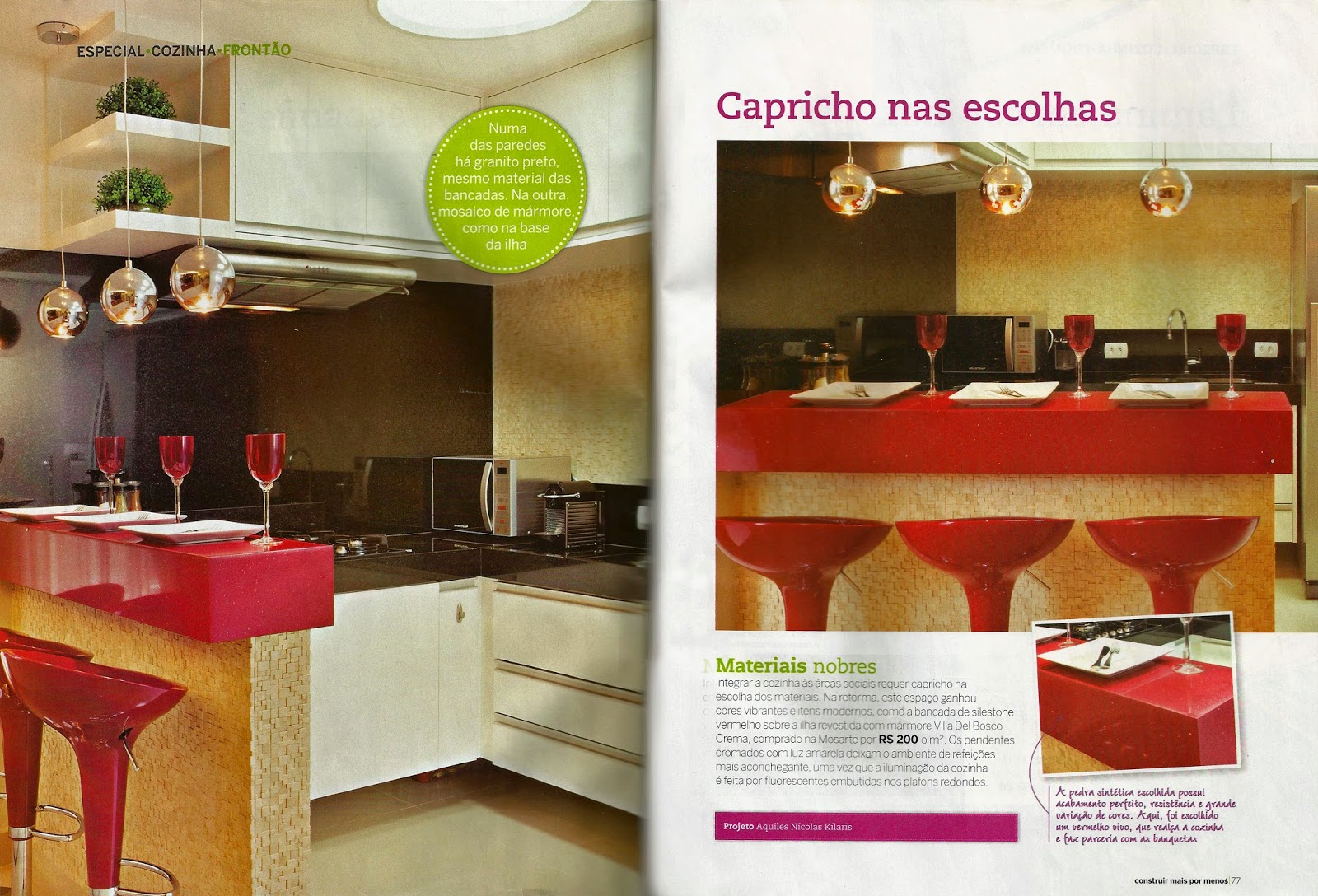 A revista Construir Mais por Menos – Especial Cozinhas, número 6, publicou o projeto do arquiteto Aquiles Nícolas Kílaris para a reforma de uma cozinha. Com a integração do ambiente ao restante da casa, os materiais foram escolhidos com requinte.