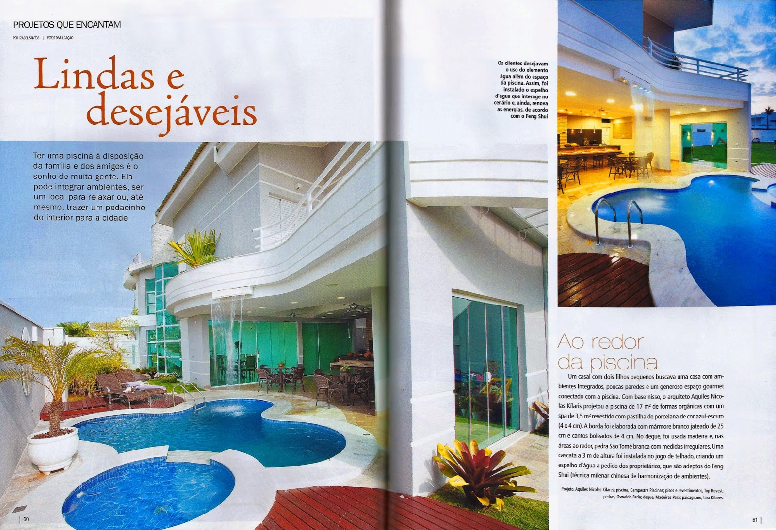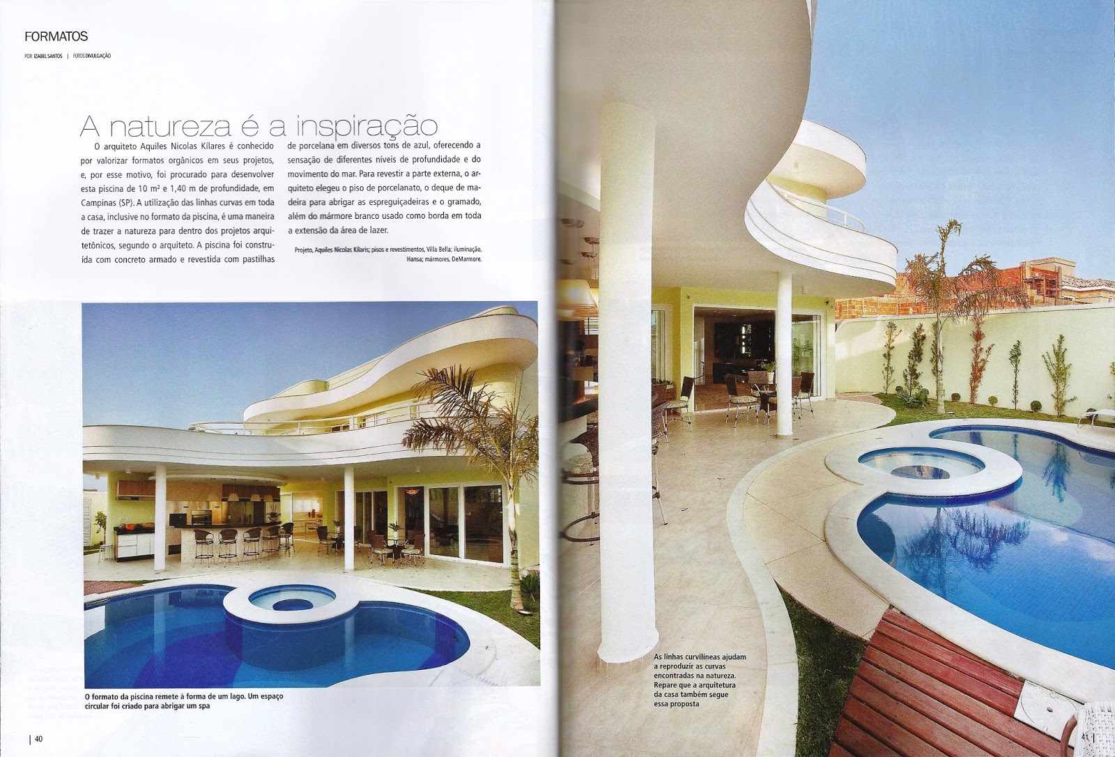 A utilização das linhas curvas em toda a casa, inclusive no formato da piscina, é uma maneira de trazer a natureza para dentro dos projetos do arquiteto Aquiles Nícolas Kílaris. A revista Guia da Piscina, número 1, publicou dois de nossos projetos.