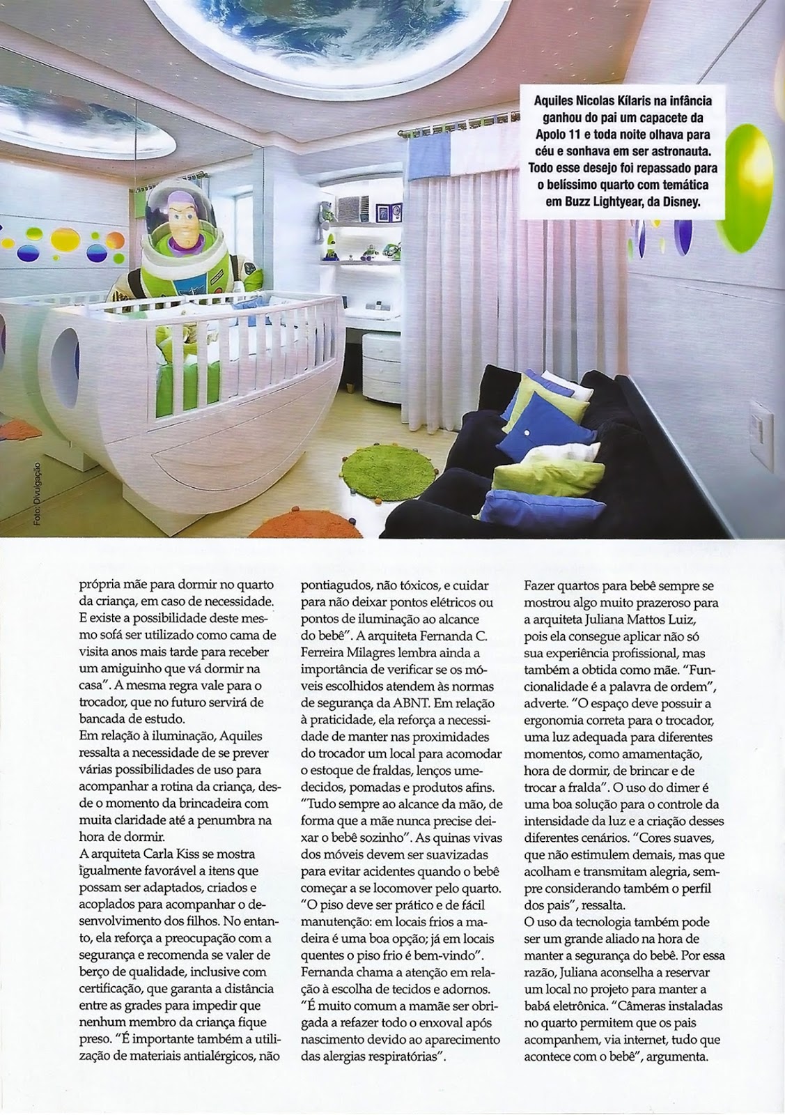 O quarto de bebê, com temática do Buzz Lightyear, projeto do arquiteto Aquiles Nícolas Kílaris, foi publicado na revista Ambientare Revest. O ambiente deve ser, acima de tudo, prático e seguro, mas é difícil não usar a imaginação nesse universo infantil tão amplo.