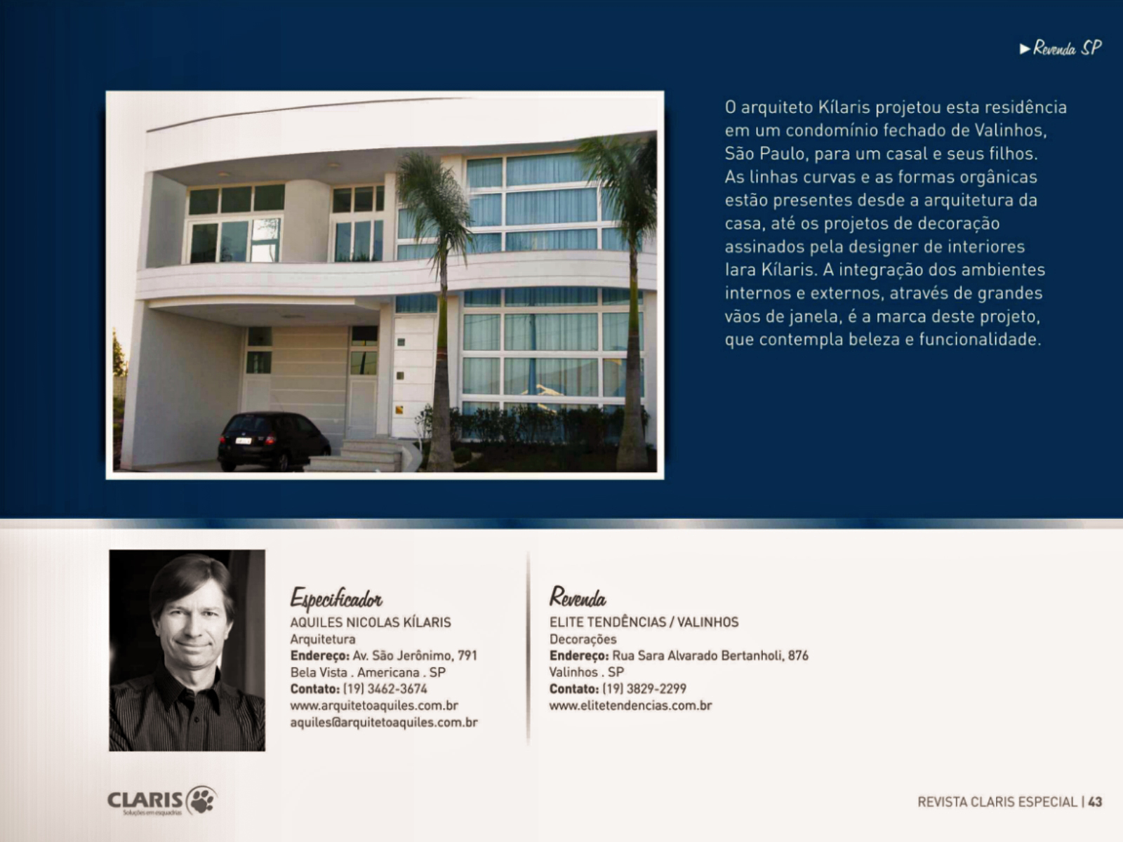 O arquiteto Aquiles Nícolas Kílaris projetou esta residência em um condomínio fechado de Valinhos. As linhas curvas e as formas orgânicas estão presentes desde a arquitetura da casa, até o projeto de decoração assinado pela designer de interiores Iara Kílaris. A revista Claris, edição 1, publicou a matéria.