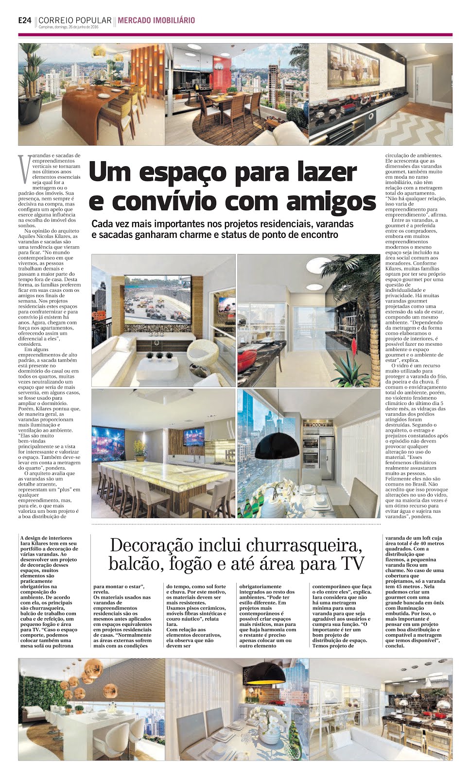 Cada vez mais importantes nos projetos residenciais e de decoração, as varandas e sacadas ganharam charme e status de ponto de encontro. O jornal Correio Popular, de 26 de junho, publicou projetos e dicas do arquiteto Aquiles Nícolas Kílaris e da designer de interiores e paisagista Iara Kílaris.