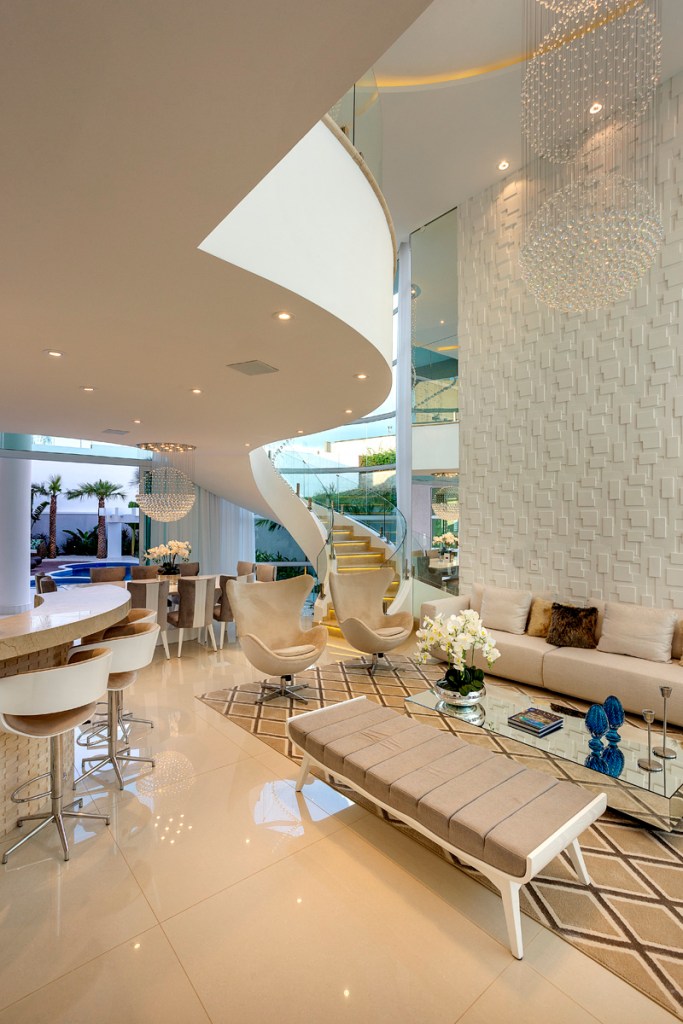 No projeto da Casa Flor de Liz, o espelho é um dos destaques do living. Ele foi usado em um grande painel, acompanhando o pé direito duplo do imóvel, conferindo ainda mais amplitude e luminosidade ao espaço, pois acaba refletindo a luz natural do ambiente externo.