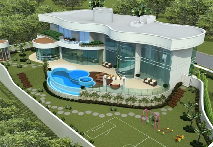 O imóvel, projetado com 765,43 m² de área construída, possui uma fachada imponente com pé direto duplo e uma volumetria vertical marcante, revestida em mármore 3D, que confere identidade ao projeto. No pavimento térreo está distribuída toda a área social, com living, sala de jantar, lavabo, home theater, cozinha e lazer completo.