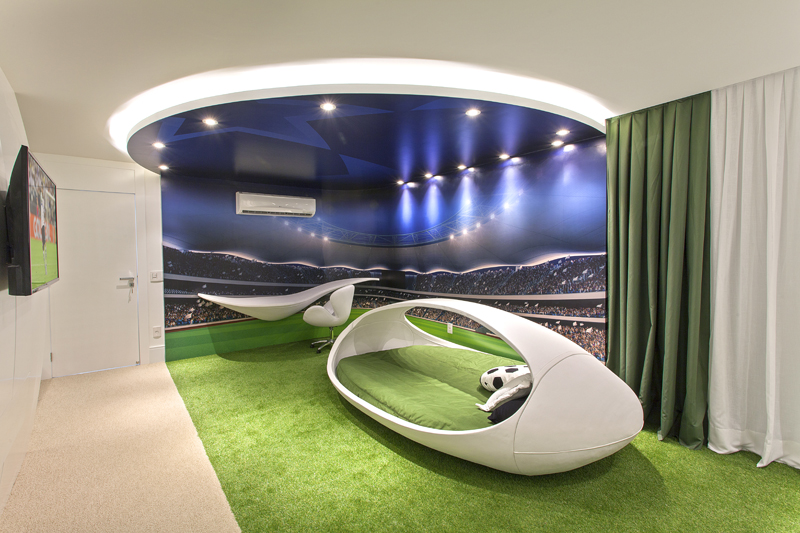 O quartos temáticos são uma tendência na decoração de interiores. Eles refletem a personalidade e o gosto pessoal de seus donos e se transformam no cenário ideal para muitas atividades, que variam de acordo com a idade de quem vai usá-lo. Na Casa Privilége, o quarto do filho foi ambientado em um campo de futebol e a cama projetada na aconchegante forma de uma bola.