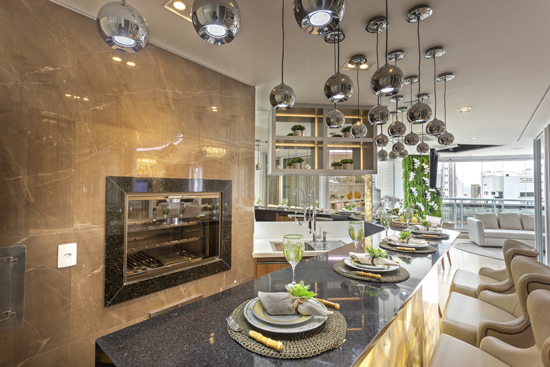 A designer Iara Kílaris, que assina toda a decoração de interiores, idealizou vários pendentes acima do balcão para promover a iluminação direta. Churrasqueira, pia e chopeira complementam o espaço. A varanda gourmet está separada da cozinha por grandes portas de vidro. Pedras retroiluminadas foram usadas na base do balcão e na churrasqueira.