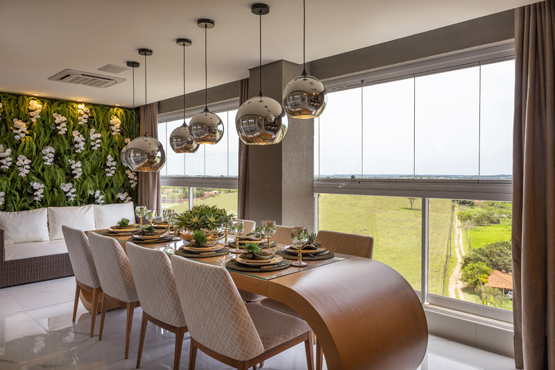 A varanda do Apartamento Itália, localizado em São José do Rio Preto, é um dos destaques do imóvel. A grande mesa com cantos arredondados e oito lugares foi desenhada especialmente para o projeto.