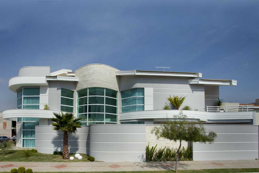 Para conferir movimento à fachada, o arquiteto criou frisos de rebaixos e molduras que valorizam os caixilhos de vidro. Os passeios do paisagismo são de pedra portuguesa, placas de concreto, palmeiras e arbustos cor verde e frisos nas fachadas e muros.