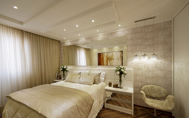Contemporaneidade e aconchego. Esses foram os conceitos usados pela designer Iara Kílaris ao assinar o projeto da suíte máster do Apartamento Indaiatuba. A palete de cores utilizada é clara e um painel de espelho foi colocado na cabeceira da cama (destaque na foto).