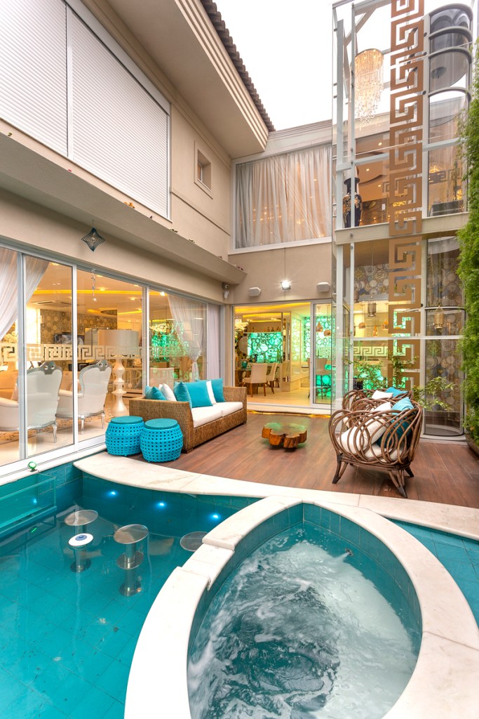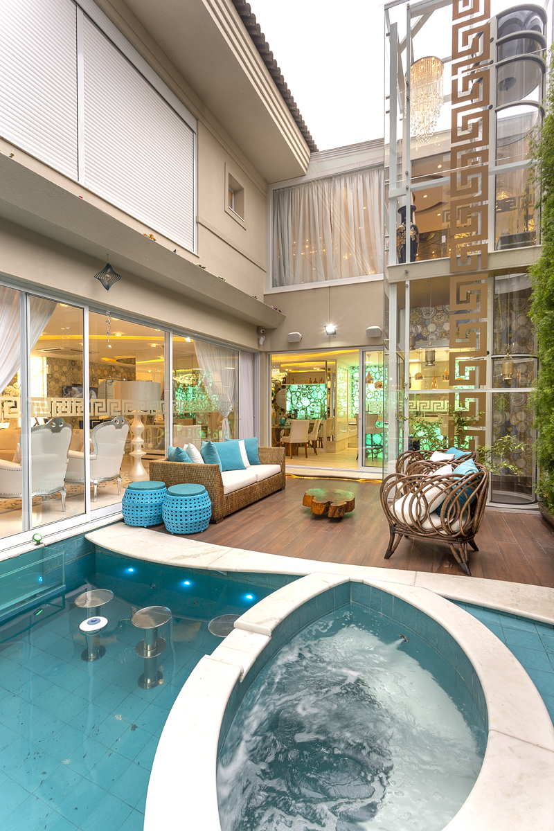 A área de lazer da Casa Versace foi pensada para promover lazer e momentos de relaxamento. Piscina e sofás para contemplação e um grande espelho que reflete toda esta beleza estão integrados com o espaço gourmet. O ambiente está localizado na saída da sala de almoço, que foi concebida com uma mesa de tampo de vidro e a base de tronco de árvore esculpido pela natureza.
