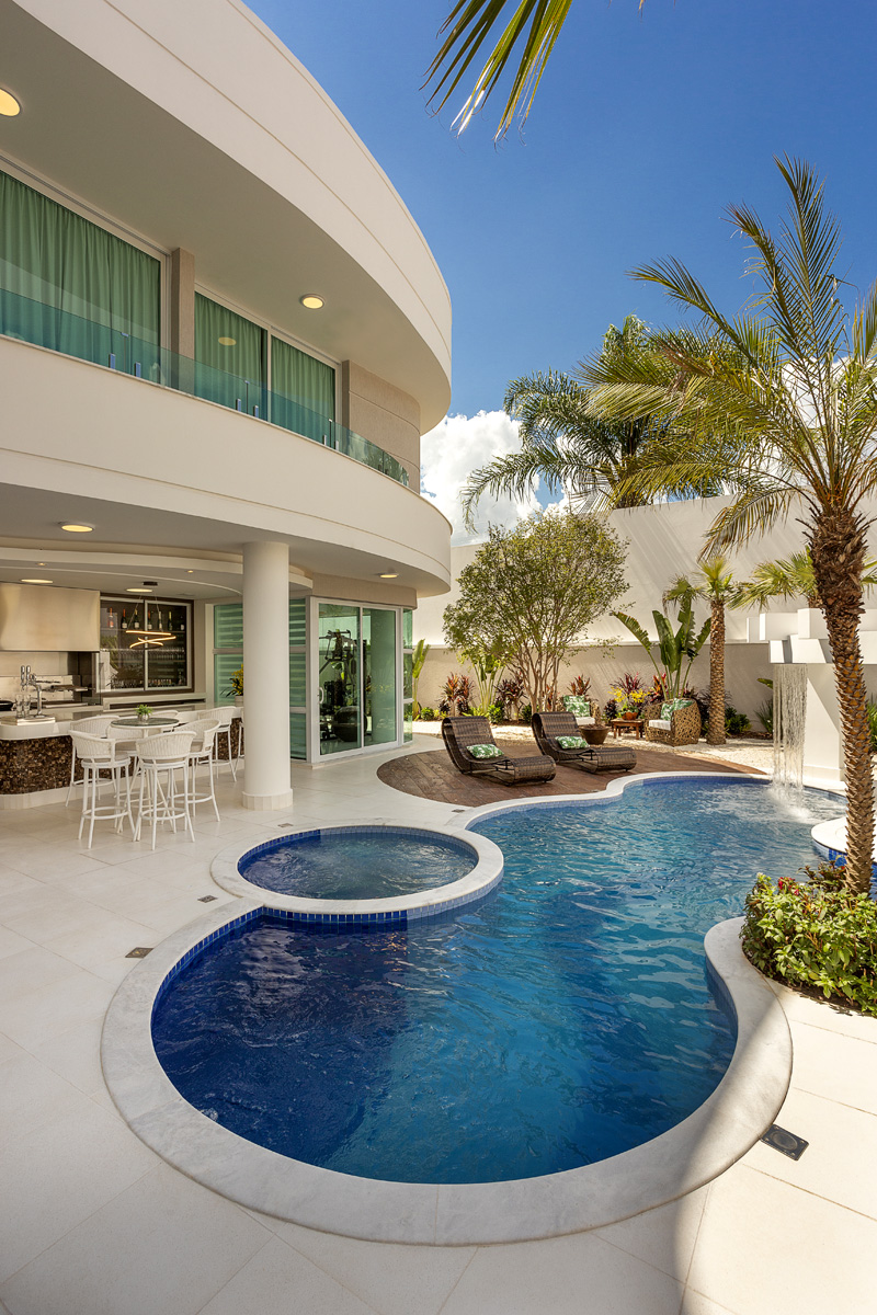 Nela estão o espaço gourmet completo com bancada sinuosa com chopeira e mesas para acomodar os convidados. A piscina em formato orgânico tem Spa com água quente e pergolado com queda d´água. O lazer é rodeado por um jardim tropical com jabuticabeira e vários recantos de