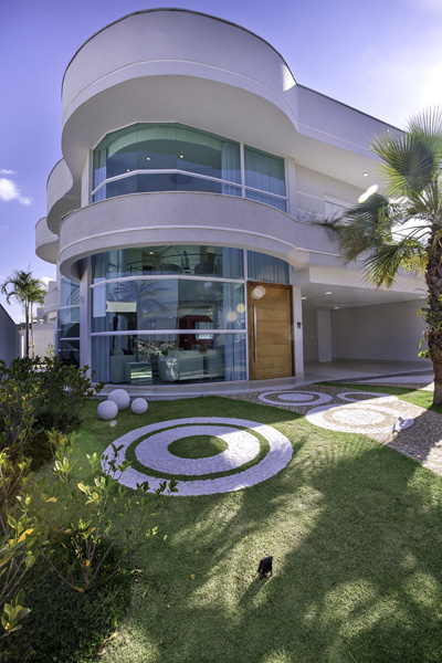 Logo na entrada, o teto em gesso com efeito luminotécnico e a escada sinuosa chamam a atenção. A área social é toda voltada para os jardins externos e para a entrada lateral que oferece acesso a área de lazer. Neste ambiente encontramos uma bela piscina em formato orgânico com cascata saindo da laje e espaço gourmet, com acabamentos que mesclam o rústico com o contemporâneo.