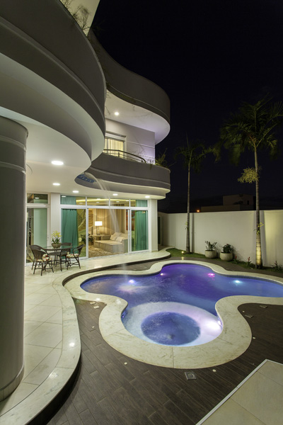 A área social da Casa Damha, assinada pelo arquiteto Aquiles Nícolas Kílaris, é toda voltada para os jardins externos e para a entrada lateral que oferece acesso direto para a área de lazer. Além do belo jardim, o lazer é composto por uma piscina em formato orgânico com cascata saindo da laje e espaço gourmet – churrasqueira, fogão, pia de trabalho, bancada de refeição, banquetas e mesas de apoio – com acabamentos que mesclam o rústico com o contemporâneo.