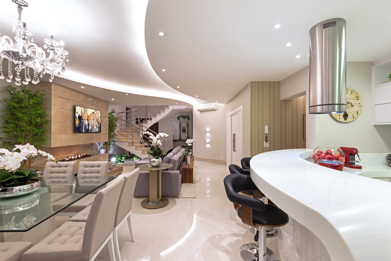 A cozinha é extensão da sala de jantar e a bancada de refeições separa os espaços. A ilha de trabalho, com coifa e fogão abraça a cozinha, que recebeu decoração na parede. Objetos de decoração em vermelho conferem vida ao espaço. Desta forma, o “Chef” pode receber seus convidados e interagir com eles enquanto cozinha.