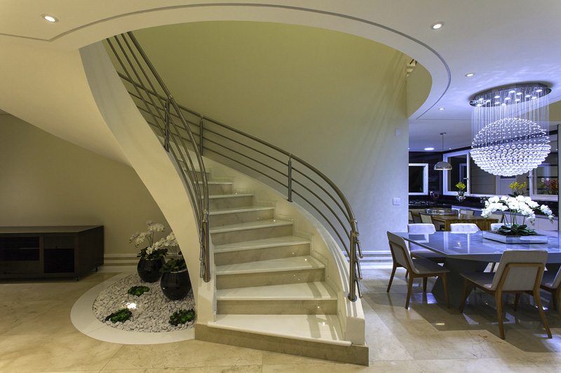 Muito mais que uma área de acesso à parte íntima, esse espaço foi projetado para ser aproveitado pelos moradores. Possui vista para o andar inferior e para a área externa. Um cantinho com mesa e poltronas e um trabalho diferenciado nos rodapés e no gesso do teto.