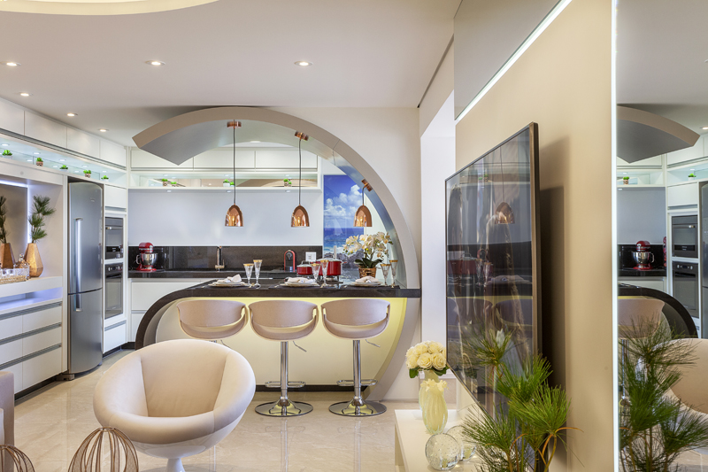 A área social é ampla e aberta, completamente integrada. A única delimitação é a da cozinha, feita por uma bancada larga de forma diferenciada, com um grande arco superior. Banquetas confortáveis foram colocadas na bancada para refeições rápidas.