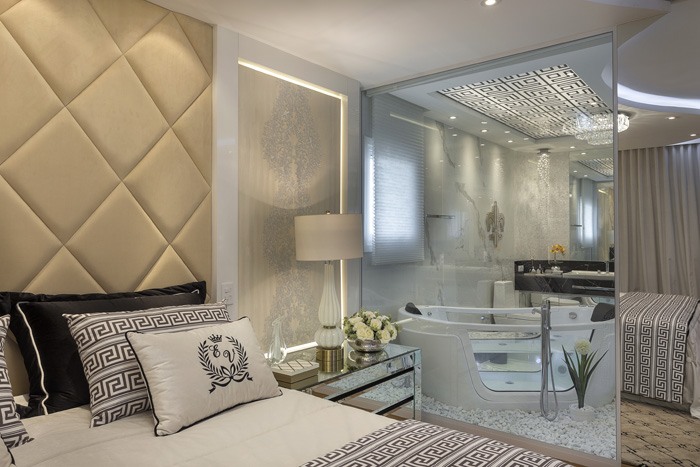 Já a suíte máster é grande e muita espaçosa e acomoda uma sala de banho e closet. Destaque para a banheira solta, totalmente transparente, que pode ser observada do quarto por uma porta de vidro. Para momentos de intimidade, basta baixar a persiana e o local fica preservado.
