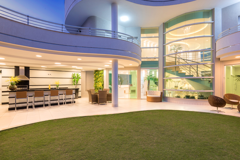 A Casa Novo Mundo, localizada em Americana/SP, foi construída em um lote padrão de condomínio, prova que com um bom projeto é possível construir uma casa grandiosa e completa em qualquer terreno. O projeto é assinado pelo arquiteto Aquiles Nícolas Kílaris. A área de lazer, que pode ser vista de toda a casa, é acessada também pelo home theater e pela cozinha através de portas de vidro que aumentam a luminosidade.