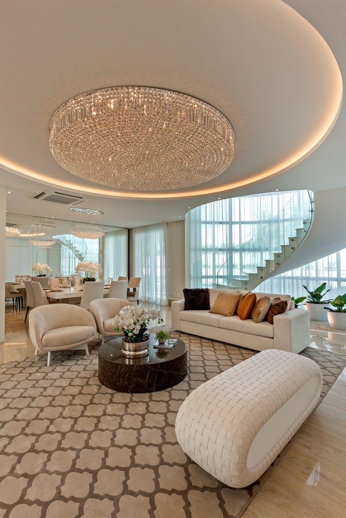 Uma belíssima escada dá acesso ao pavimento superior, onde estão três suítes e o quarto máster com closet e banheiro. Uma grande porta de vidro integra a área de lazer, que é cenário para os ambientes internos. Ela é composta por espaço gourmet, piscina em forma orgânica, vestiários e academia.