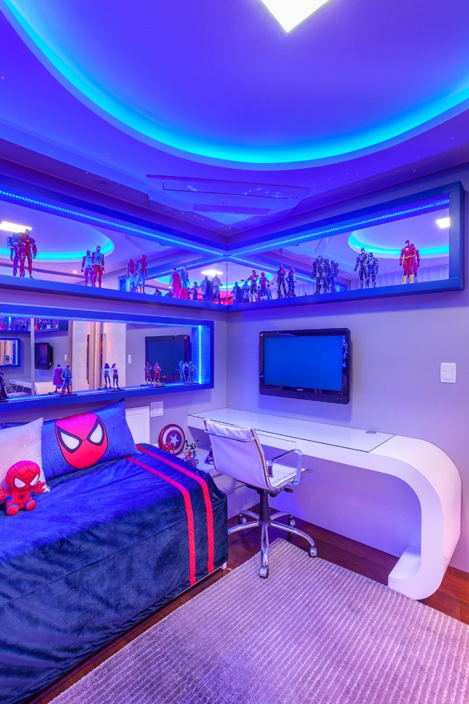 Os quartos temáticos são uma tendência na decoração de interiores. Eles refletem a personalidade e o gosto pessoal de seus donos e se transformam no cenário ideal para muitas atividades, que variam de acordo com a idade de quem vai usá-lo. No Apartamento Gothan, assinado pela designer de interiores Iara Kílaris, o quarto do filho foi ambientado com o tema de super-heróis, todo em azul e vermelho.