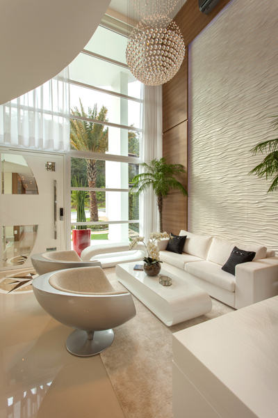 No projeto de interiores da Casa Vanessa, que leva a assinatura da designer Iara Kílaris – a escolha foi pelos acabamentos e decoração clean, com móveis contemporâneos básicos e peças complementares diferenciadas. Materiais rústicos – como juta, madeira e pedra – contrastam com elementos futuristas como pastilhas, pendentes e esculturas de inox, iluminação com LED e neon, criando ambientes muito requintados.