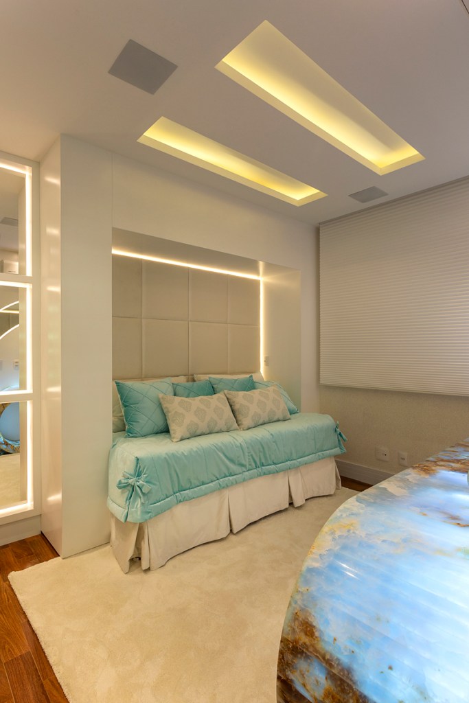 Um dos quartos, todo em branco e Tiffany, possui papel de parede com mini cristais e uma bancada feita de pedra especial importada, a ônix turquesa (destaque na foto). Outro em preto e branco, tem como inspiração as grandes marcas do mundo da moda.