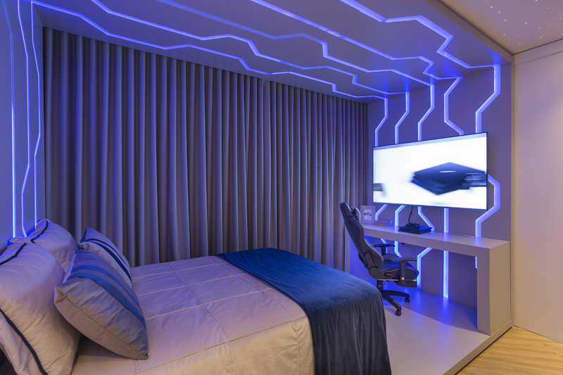 O projeto previu ainda iluminação diferenciada, remetendo aos jogos de computador, bancada de de estudos e uma super cadeira gamer.